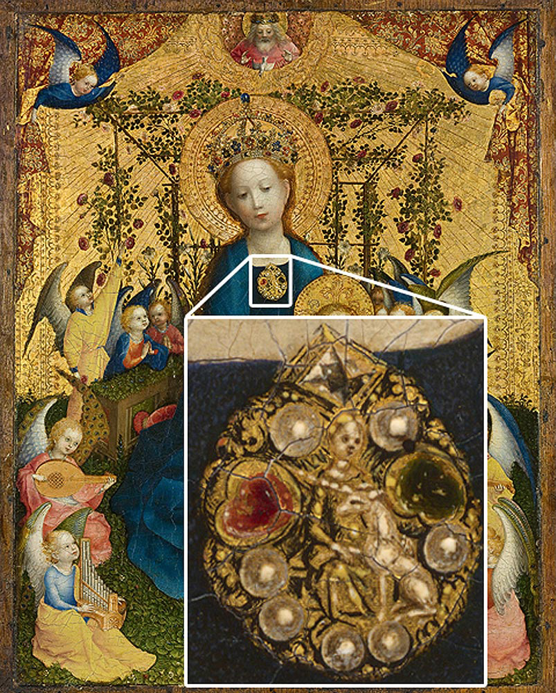 Detailaufnahme der nur 2,5 cm hohen Brosche aus Stefan Lochners „Muttergottes in der Rosenlaube“, WRM 0067. Die Perlen und das figürliche Relief der Brosche erscheinen dem Betrachter durch die körperhaften Farbakzente in ihrer Form geradezu greifbar zu sein.