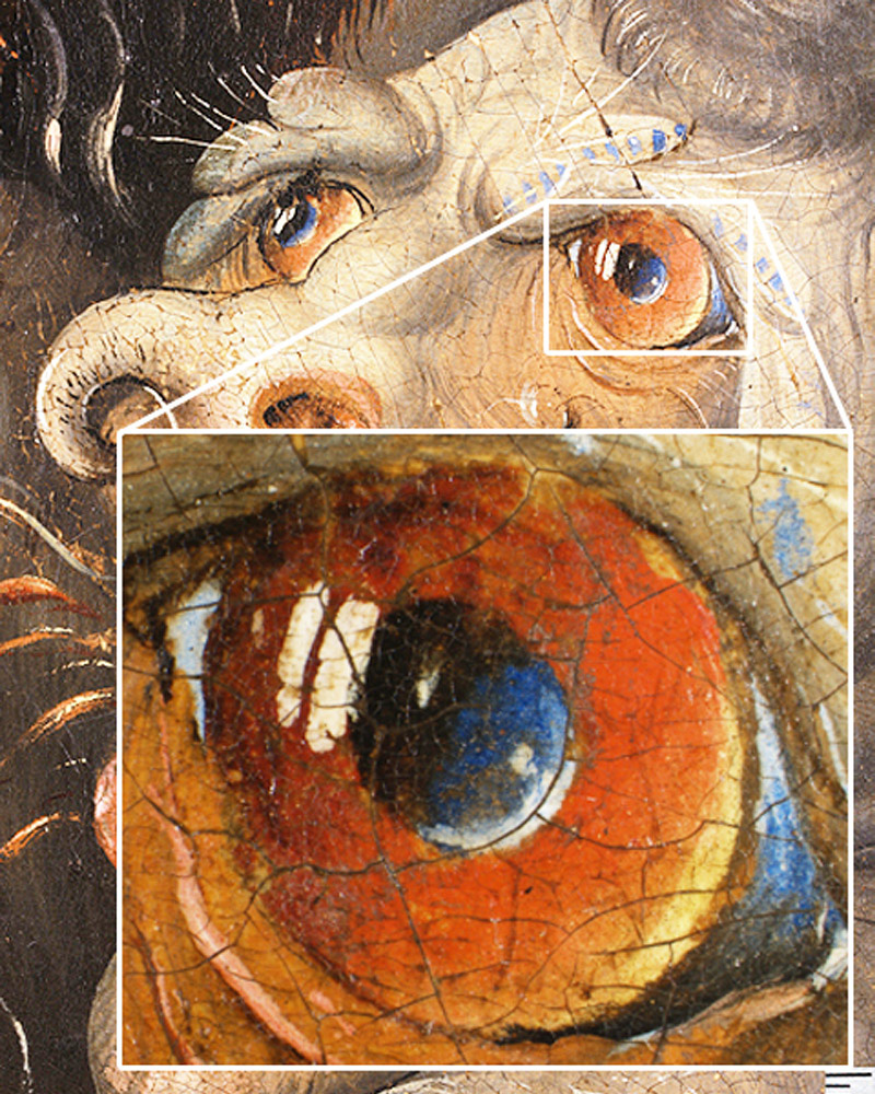 Detailaufnahme des Teufels aus Stefan Lochners „Weltgericht“, WRM 0066: Der am rechten unteren Bildrand des Weltgerichts dargestellte Teufel ist in seiner vielgestaltigen Oberfläche und farbenprächtigen und detailreichen Ausführung nahezu einzigartig.