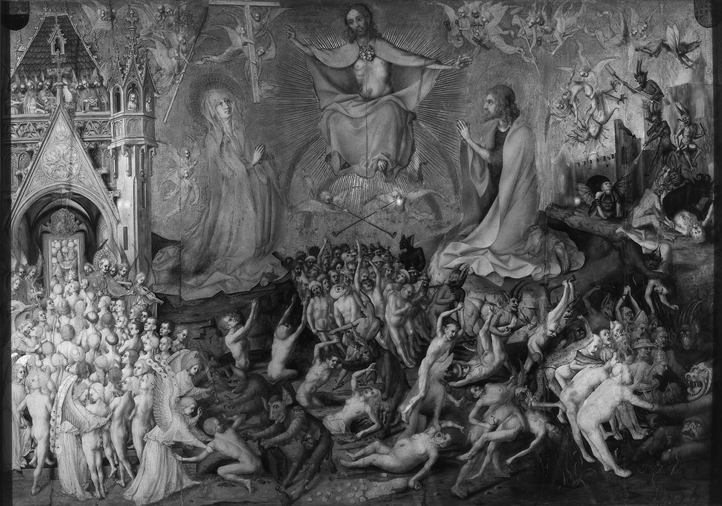 Infrarotaufnahme von Stefan Lochners „Weltgericht“, WRM 0066: Die Infrarotaufnahme macht die künstlerisch herausragende Unterzeichnung von Stefan Lochner sichtbar.