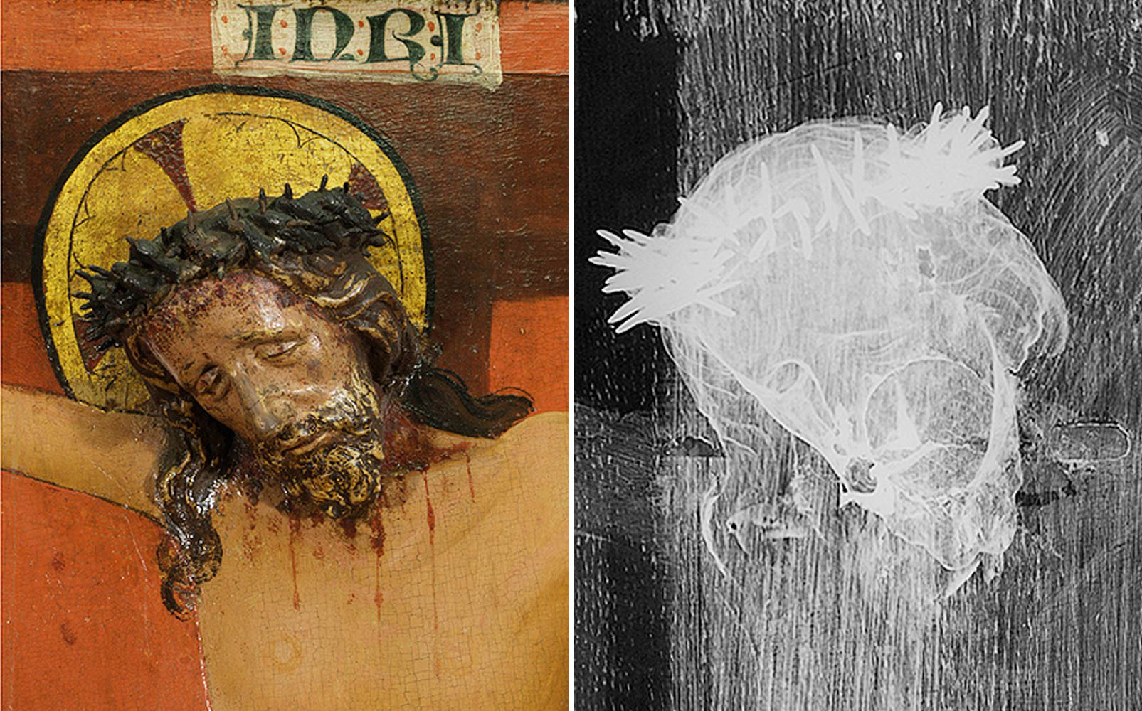 Detail und Röntgenaufnahme: Kölnisch, Christus am Kreuz zwischen Maria und Johannes, um 1425/30, Eichenholz, Wallraf-Richartz-Museum & Fondation Corboud, WRM 0057.
