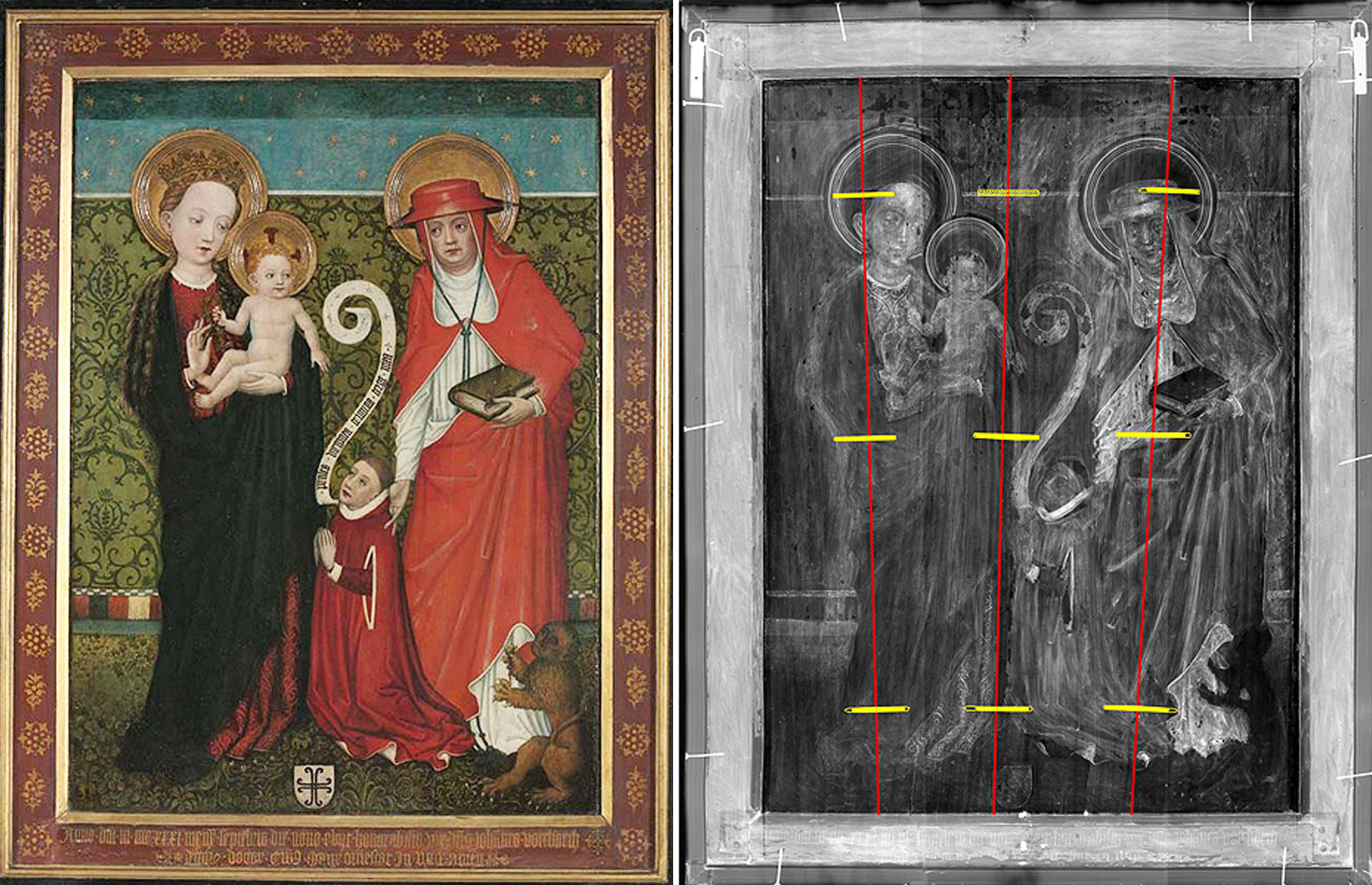 Detail und Röntgenaufnahme: Kölnisch, Maria mit Kind und dem Heiligen Hieronymus, 1440/50, Tannenholz, Wallraf-Richartz-Museum & Fondation Corboud, WRM 0071. Die im Röntgenbild kartierten Brettfugen und Dübel veranschaulichen die Konstruktion des Tafelbildes aus Tannenholz.