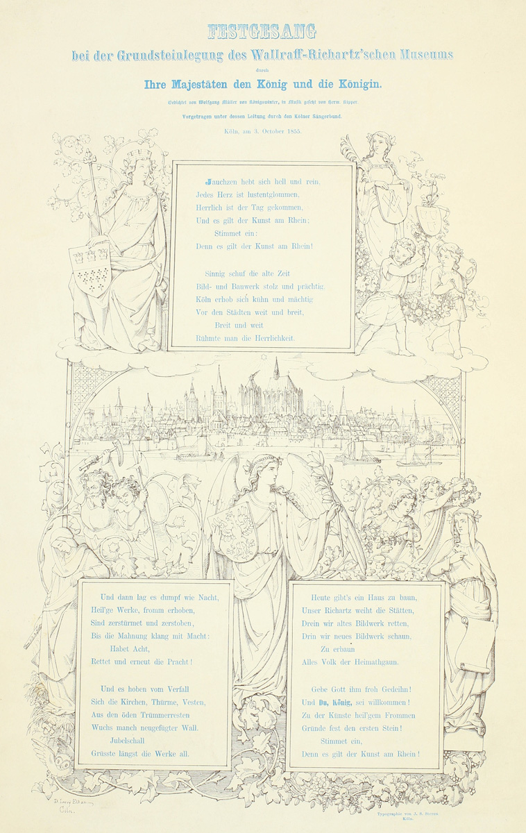 Aus diesem Anlass wirft das Wallraf mit einer eigenen Präsentation in seinem Foyer (21.10.-16.11.25) einen Blick in die Vergangenheit und auf jene Erinnerungsstücke, die vor 170 Jahren in den Grundstein des ersten Wallraf-Richartz-Museums eingemauert wurden. Am 3. Oktober 1855 war der preußische König, Friedrich Wilhelm IV. (1795–1861), eigens nach Köln gekommen, um morgens einen Grundstein für die erste feste Rheinbrücke zu legen und mittags für das Wallraf-Richartz-Museum. Bei der festlichen Zeremonie wurde sowohl Ferdinand Franz Wallraf (1748–1824) als aufopferungsvoller Retter der Schätze Kölner Wissenschaft und Kunst gefeiert, als auch der anwesende Johann Heinrich Richartz, der das Museum mit seinem Vermögen erbauen ließ.