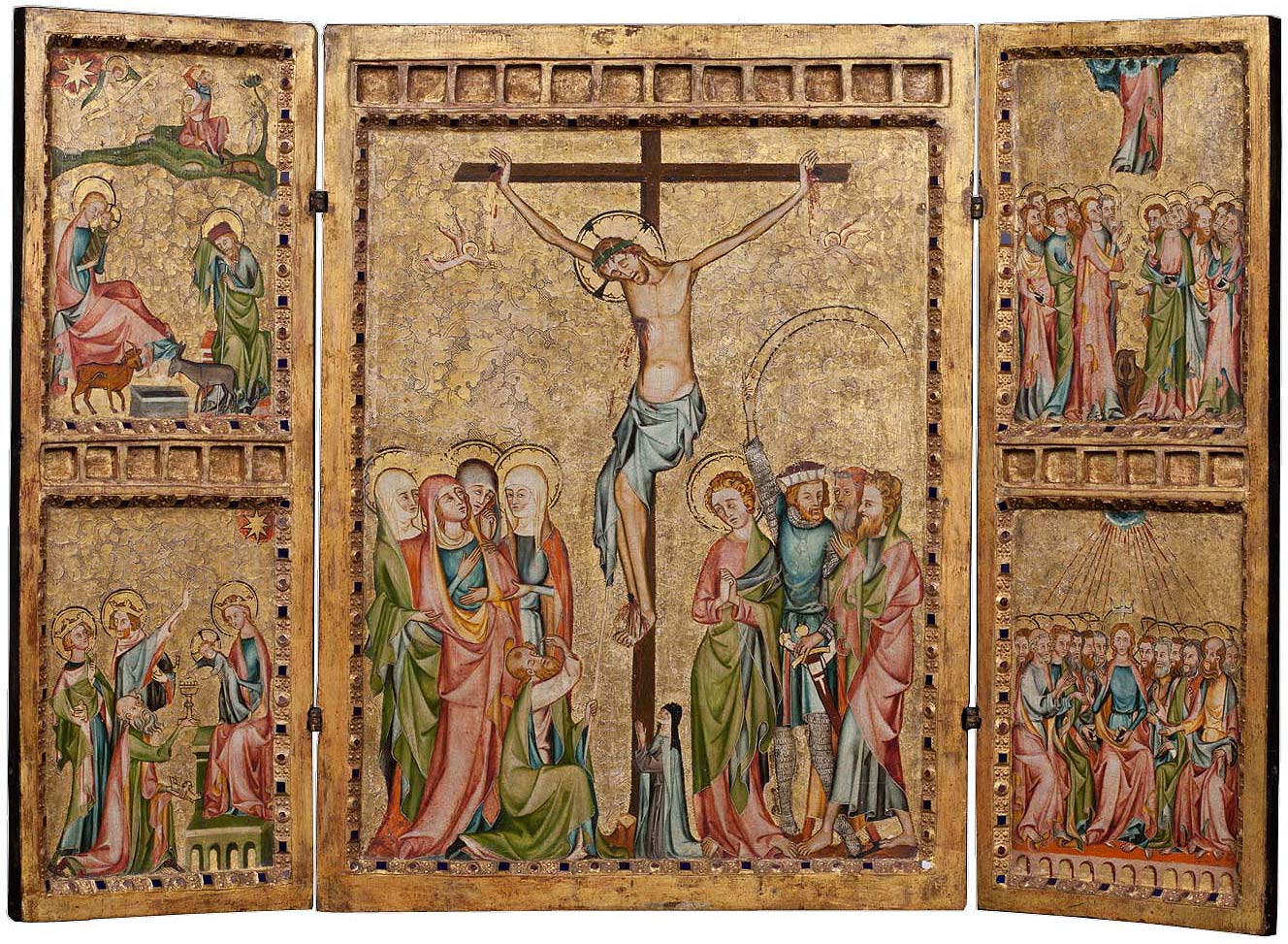 - Cologne, c. 1340 – 1350: Triptych with Depiction of the Salvation Story. Oak, central panel 65 x 48 cm, wings each 65 x 24 cm (with original frame). Collection of Ferdinand Franz Wallraf. Inv. no. WRM 0001. Photo: Rheinisches Bildarchiv Köln