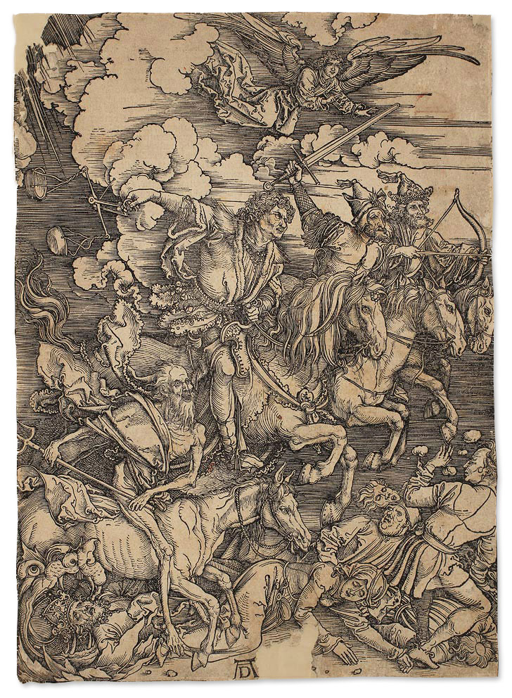 • Albrecht Dürer (Nuremberg 1471–1528 Nuremberg): The Four Horsemen of the Apocalypse, c. 1500, woodcut on vergé paper, 39.2 x 28.2 cm. Old holdings, WRM 25371