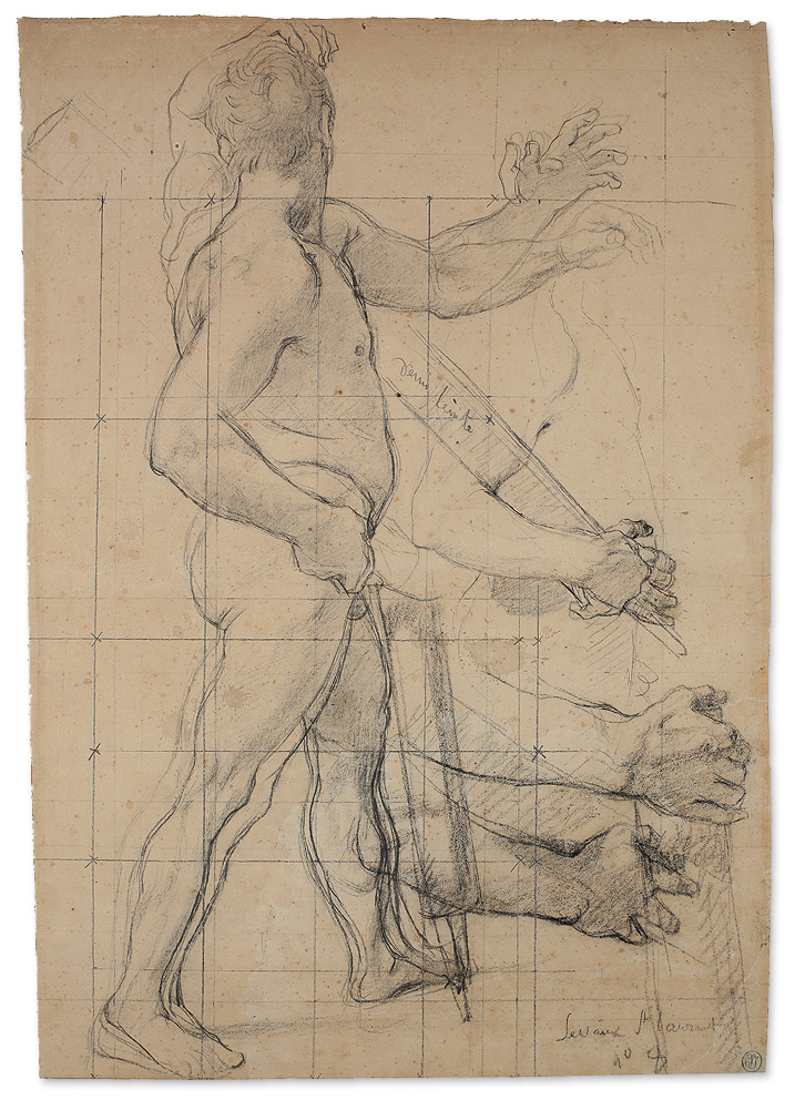 Jean-August-Dominique Ingres (Montauban 1780–1867 Paris): Studies for the Figure of a Lictor, black chalk, squaring in pencil, on vergé paper, 56.5 x 39.4 cm. Acquired in 1944, WRM 1944/13
