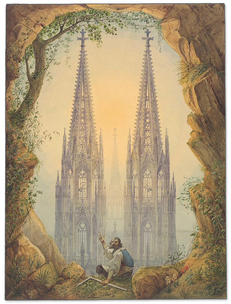 • Vincenz Statz (Cologne 1819–1898 Cologne): Vision of the Completed Spires of Cologne Cathedral (It will be finished!),  watercolour over pencil, on vergé paper, 65.5 x 48.8 cm. Old holdings, WRM Z 1704